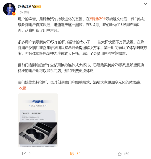 目前门店到店的新车全部更换为连体式大杯托,已经购买腾势Z9系列且希望更换杯托的用户也可以联系门店,预约免费更换杯托。