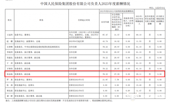 此外,中国人保在2024年底披露的第五届董事会第六次会议决议公告中,对公司高管2023年薪酬进行了清算。清算后,张金海在2023年的应付年薪为78.22万元,社会保险等单位缴纳部分为27.29万元,其薪酬合计总额为105.51万元。此外,张金海还获得2021年至2023年任期激励收入29.11万元。不出意外的话,其2024年也会有任期激励收入。