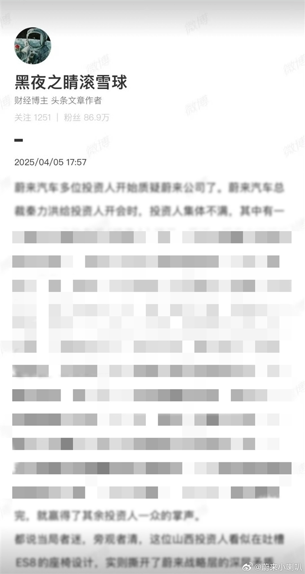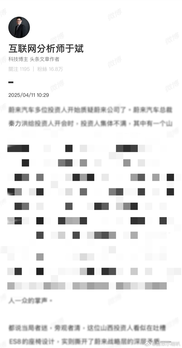 最近,“互联网分析师于斌”加班加点搞了新创作,目标是蔚来,剧本是《震惊!投资人集体吐槽蔚来》。