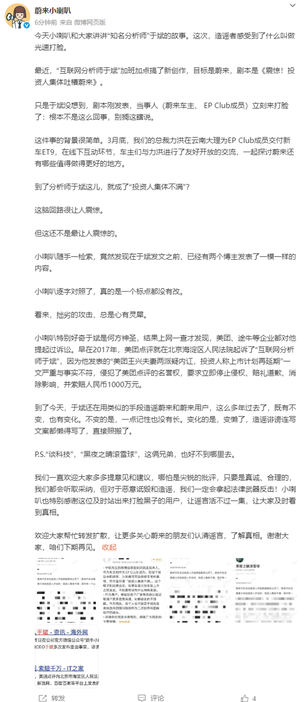 快科技4月14日消息,刚刚,蔚来汽车官方辟谣微博号“蔚来小喇叭”发布微博称:今天小喇叭和大家讲讲“知名分析师”于斌的故事,这次,造谣者感受到了什么叫做光速打脸。