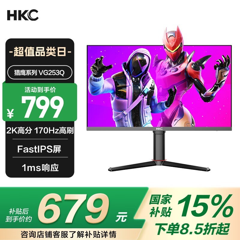 HKC VG253Q显示器促销:24.5英寸IPS面板,到手仅789元