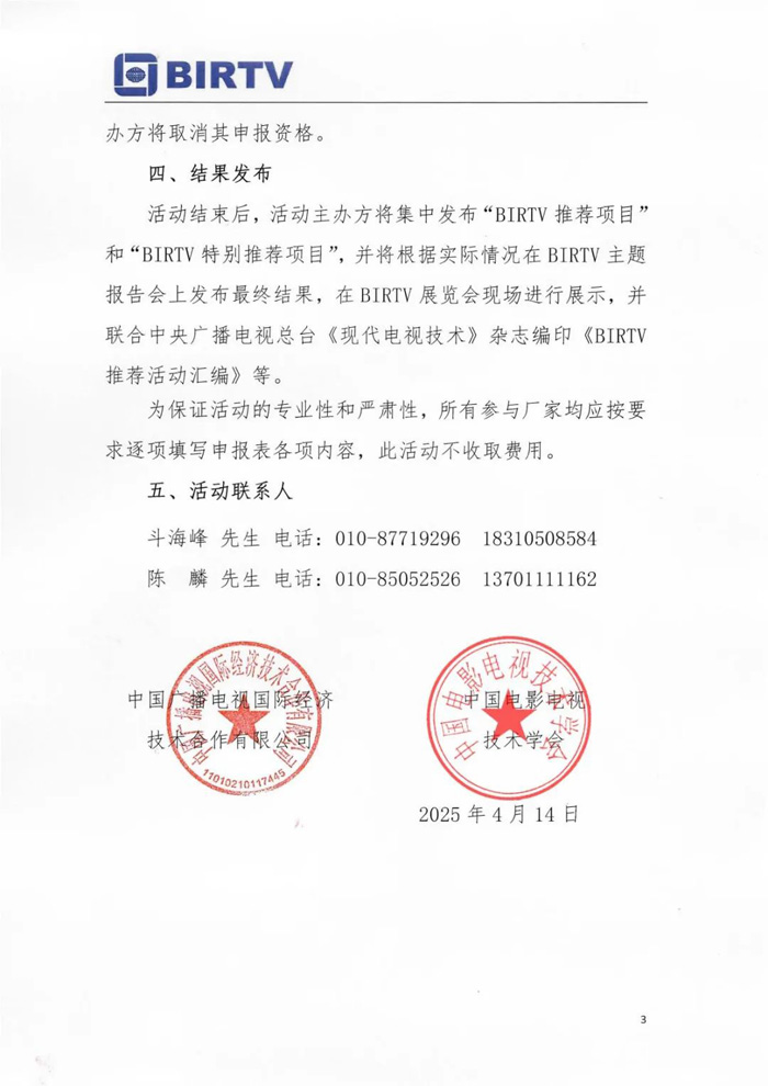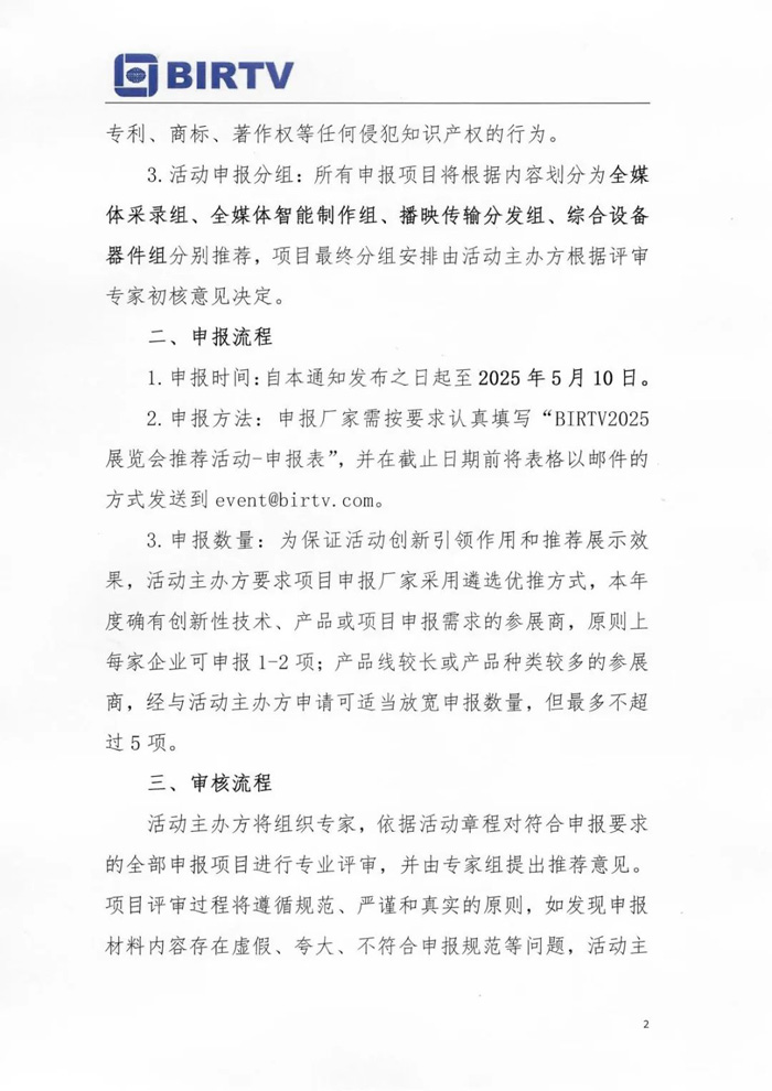 2.申报方法:申报厂家需按要求认真填写“BIRTV2025展览会推荐活动-申报表”,并在截止日期前将表格以邮件的方式发送到event@birtv.com。