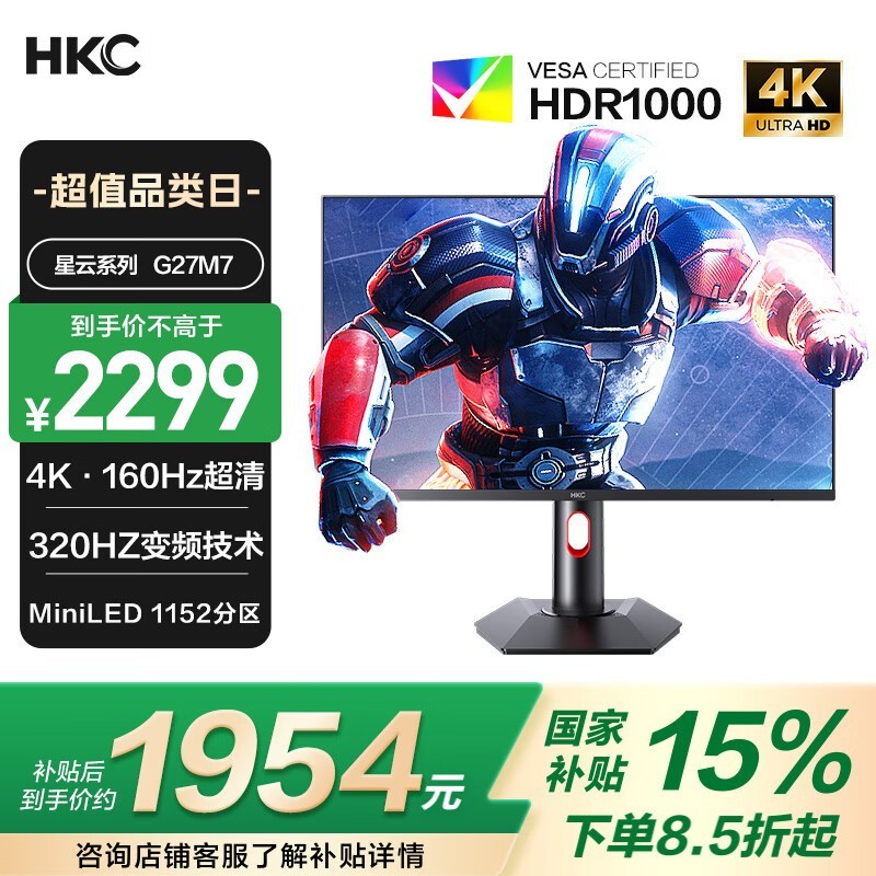 HKC G27M7 Mini-LED显示器促销到手价1900元