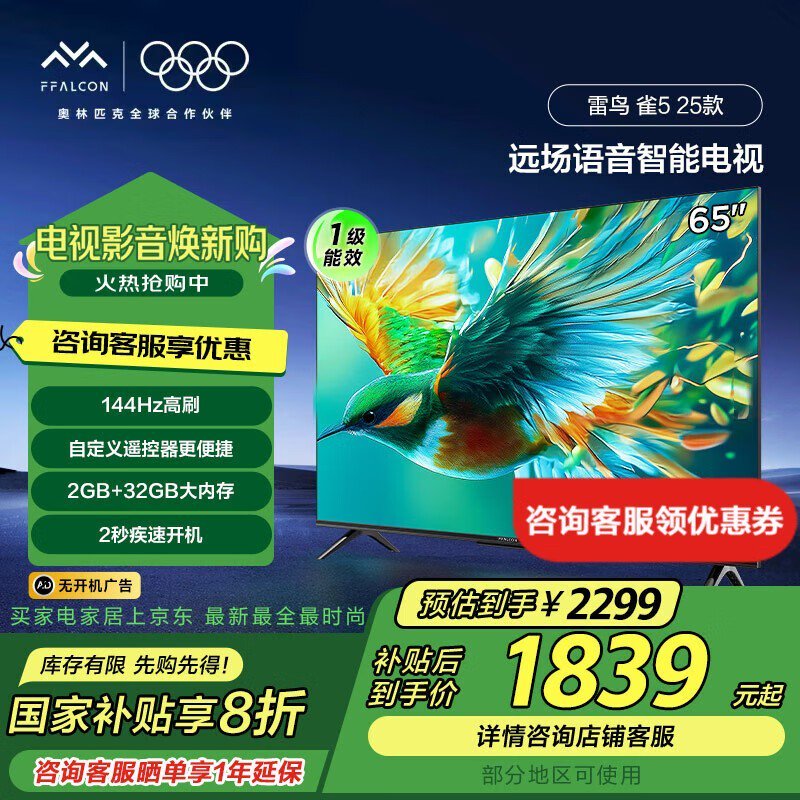 雷鸟65雀5 25款65英寸电视京东优惠价1455元
