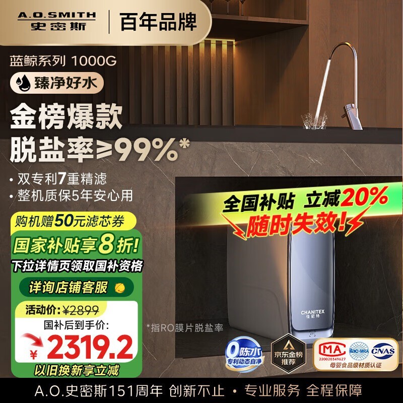 史密斯蓝鲸1000G反渗透净水器仅2799元