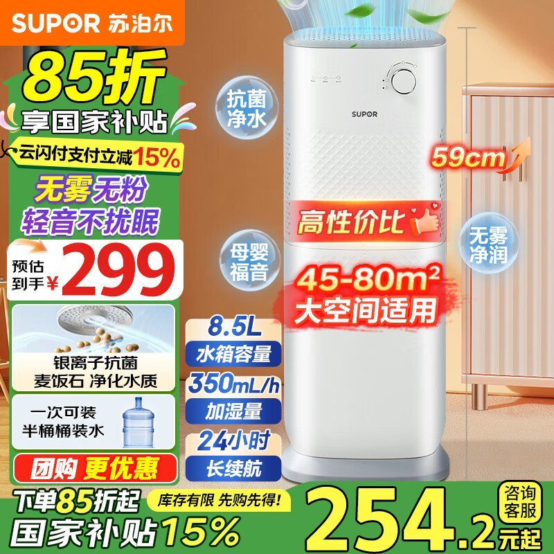 苏泊尔无雾空气加湿器EHLN-07大容量家用卧室落地立式