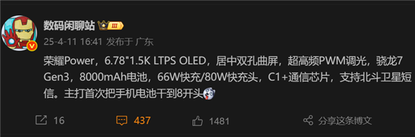 快科技4月15日消息,荣耀Power将于今晚19:30发布,这是一款主打户外体验的新机,配备了超大电池、耐摔机身、卫星通信等。