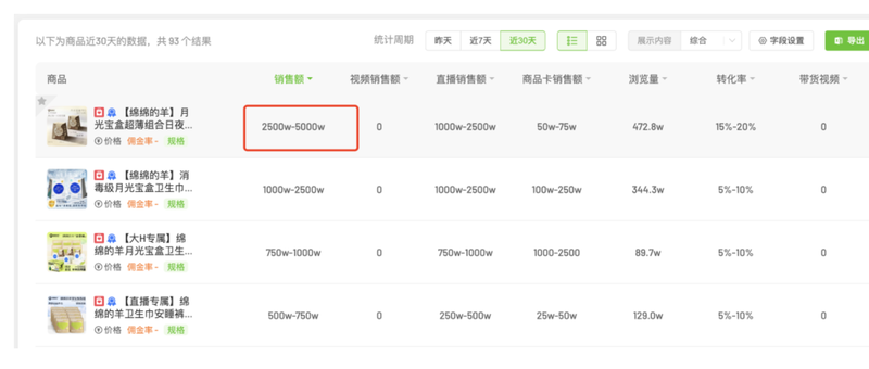 出现问题的主要是29.9元的卫生巾和23.9元安睡裤。飞瓜数据显示,绵绵的羊店铺月销售额高达7500万元,热销单品“月光宝盒”卫生巾月销售额达5000万元,占总营收六成以上。