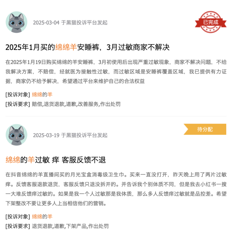 在黑猫投诉 【下载黑猫投诉客户端】上,记者以“绵绵的羊”为关键词搜索发现,出现数十条相关的投诉线索,消费者反馈的多为过敏、异物、商家不解决等问题。