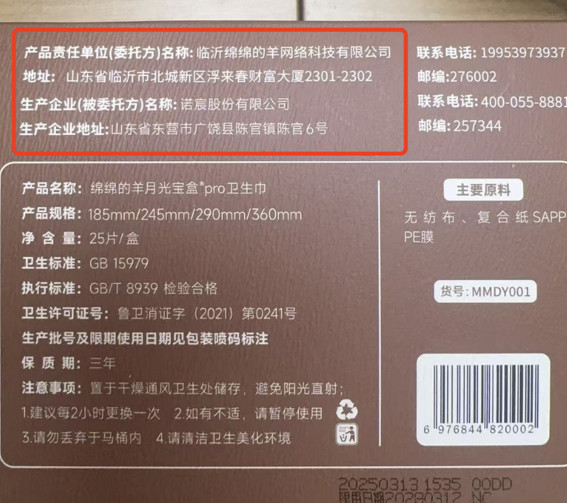 根据消费者提供的卫生巾外包装信息,绵绵的羊卫生巾产品责任单位为临沂绵绵的羊网络科技有限公司,生产企业为诺宸股份有限公司。