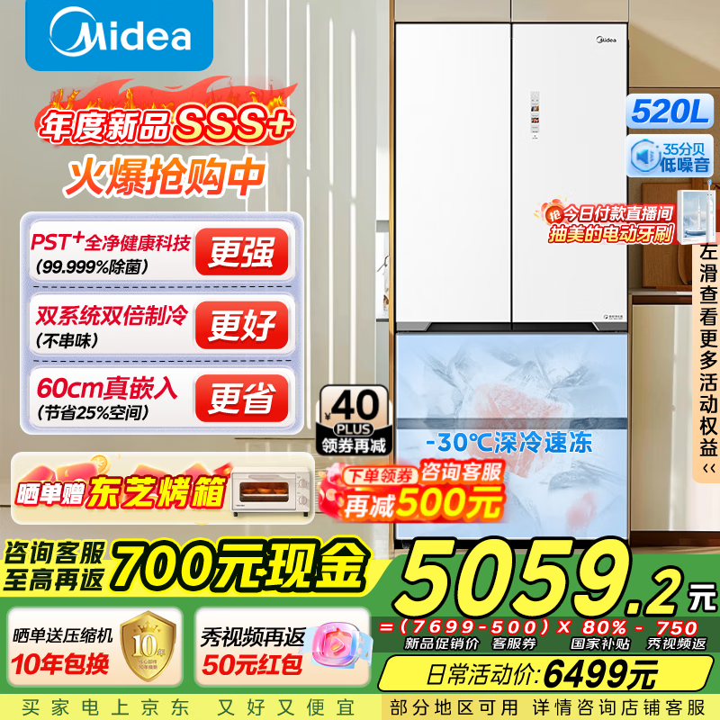 美的M60系列520L双系统法式多门冰箱仅4951元