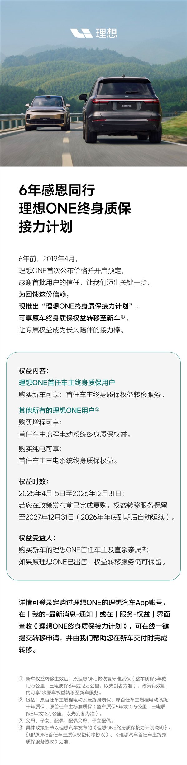 就在今日,理想汽车发布了“6年感恩同行|理想ONE终身质保「接力计划」”,理想表示: