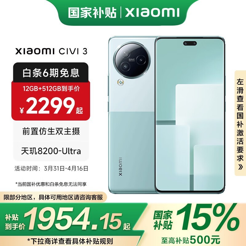 小米Xiaomi Civi 3 5G手机京东促销,到手1954元