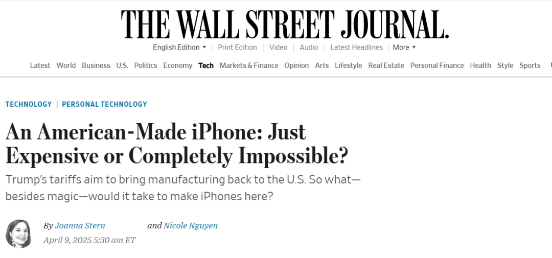 有趣的是,前几日美国WSJ技术栏目还发表文章,题为《一台完全由美国制造的iPhone:是贵得离谱还是完全不可能?》