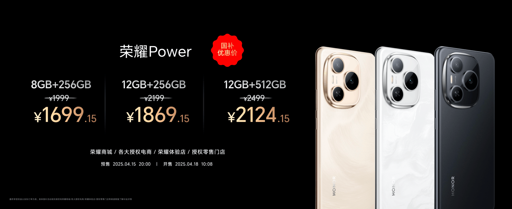 目前,荣耀Power,已于4月15日20:00开启预售,并将于4月18日10:08在荣耀商城、各大授权电商、荣耀体验店和授权零售门店正式开售,喜欢的朋友可以重点留意一下。