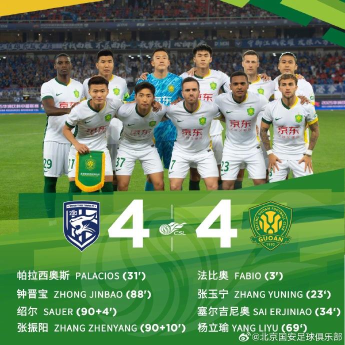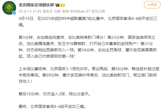 新京报讯 据北京国安足球俱乐部官博消息,4月15日,在2025华润饮料中超联赛第7轮比赛中,北京国安客场4-4战平武汉三镇。