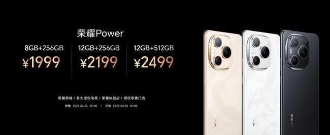 目前,荣耀Power已全面开启预售,并将于2025年4月18日10:08在荣耀商城、各大授权电商、荣耀体验店、授权零售门店正式开售。