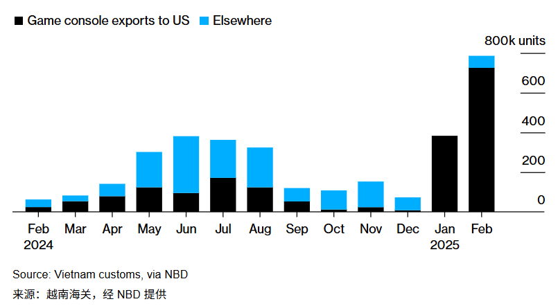 目前,NS2主要产地仍在中国,约三分之一在越南。根据彭博社调取的美国海关记录,截至去年年底,越南出货量极少,仅有少量进入美国。但今年前两个月中,几乎所有越南工厂生产的NS2都被运往了美国。