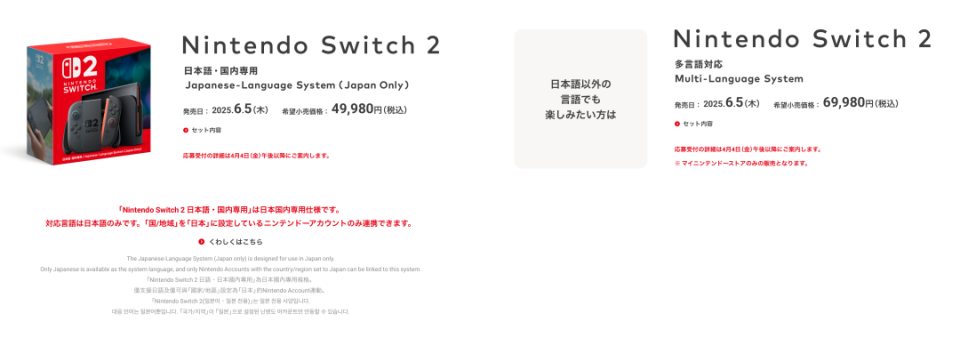 NS2日语版定价为44980日元(约为2295元人民币),虽然以任天堂一贯的硬件定价标准来看,这个接近5万日元的定价不算太低,但与国际版相比,日语版售价就显得格外“良心”。