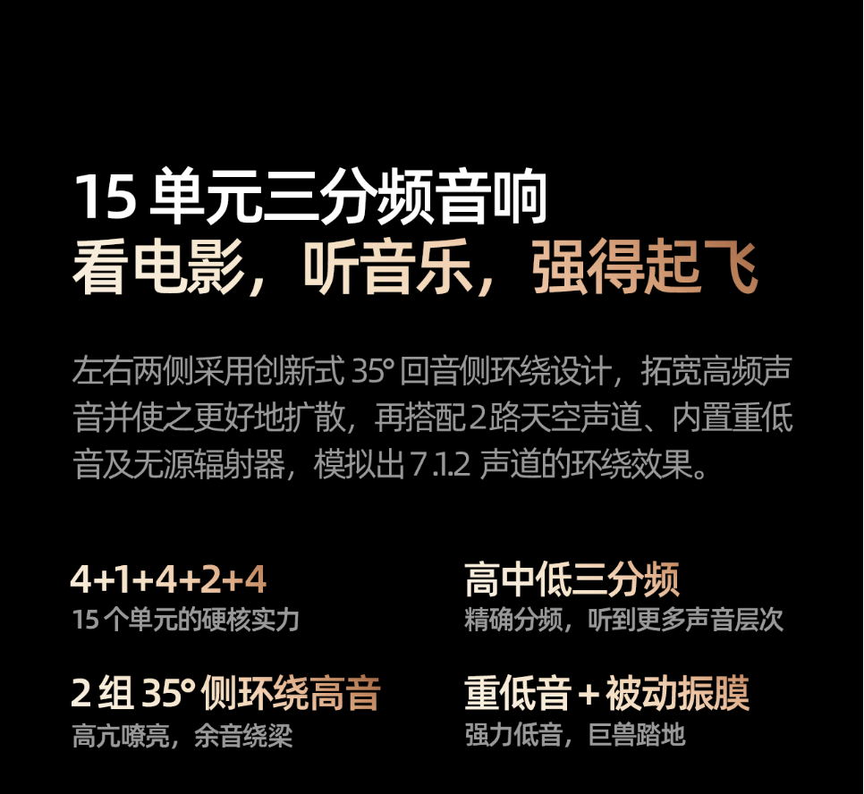 创维A6F Pro回音壁左右两侧采用创新式35°回音侧环绕设计,能够拓宽高频声音并使之更好地扩散;再搭配2路天空声道、独立重低音以及无源辐射器,打造更立体的环抱式声场。同时,机身还加入了15个声学单元,由三颗独立功放精准控制高、中、低三种声音频段,让用户能够听到更多声音的层次和细节。