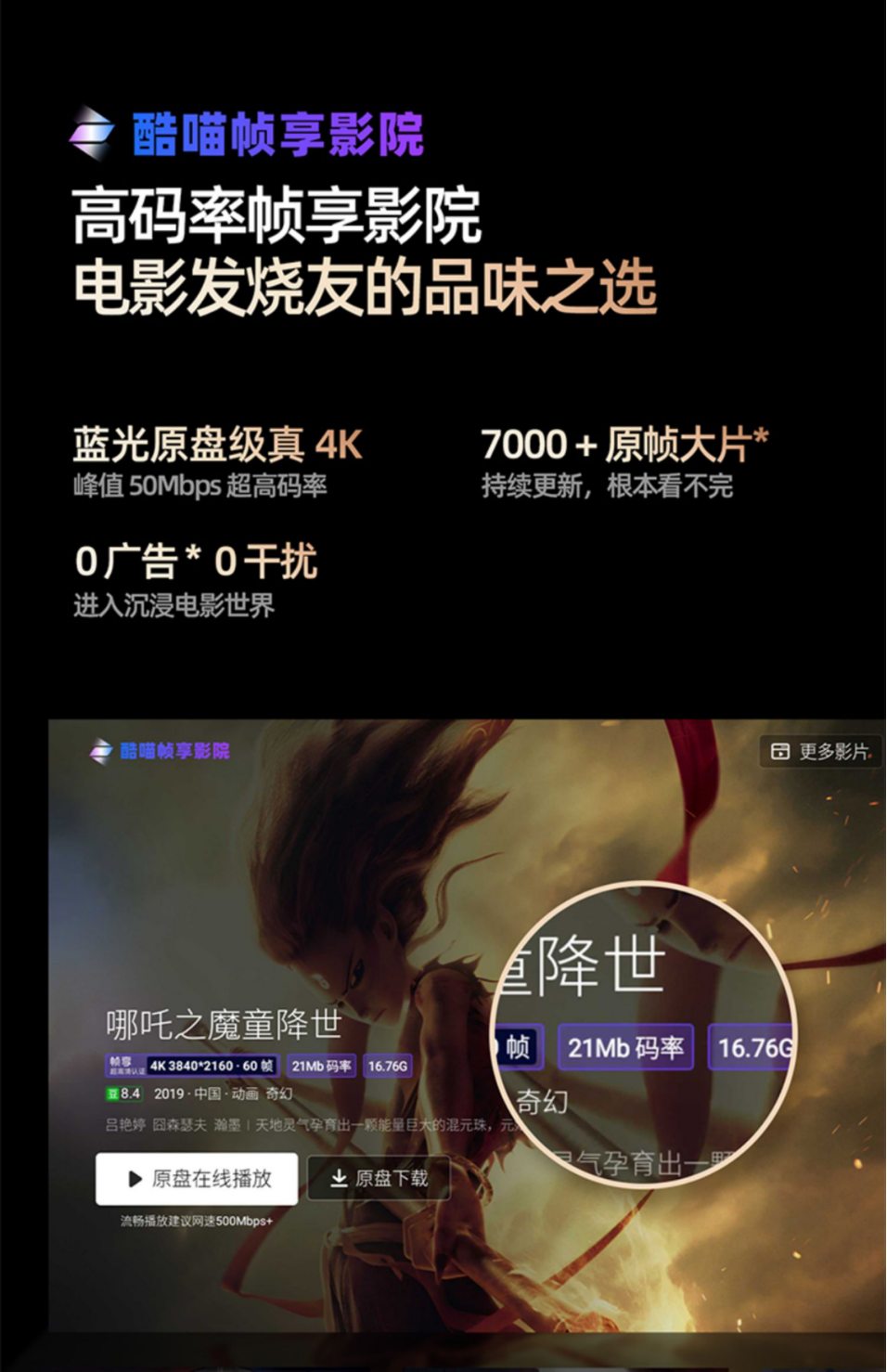 顶配的画质当然需要高码率内容资源来匹配。创维A6F Pro内置行业首发的酷喵帧享影院,并深度适配NAS主流协议,拥有7000+部真4K大片,能对画面进行工业级HDR调教,观影全程0广告、0压缩,让发烧友尽情享受家庭影院的乐趣。