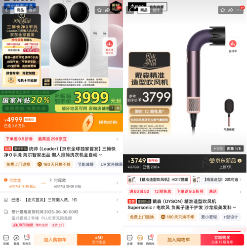 事实上,就在4月15日“2025京东新品年度盛典”举办当天,戴森Supersonic r™精准造型吹风机、戴森Chitosan™润养造型系列产品就在京东进行全网首发;4月17日,京东还将全球独家首发海尔Leader三筒懒人洗衣机,目前这款网红产品的预定量已接近4万台。