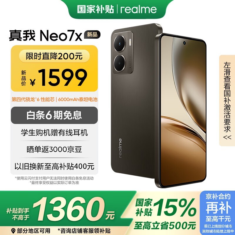 realme Neo7x 5G(12GB+512GB)京东优惠低至1262元