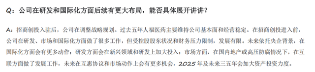所长给大家看一下人福医药近期投资者交流的原话,“招商进入前,公司在研发、市场和国际化方面做了很多工作,但受控股股东状况和财务压力限制,发展有限。未来依托央企背景,在国际化方面会有更多动作;研发方面会在新兴领域和研发上加大投入;市场方面,在国内地产或高压防腐情况下,在互联方面做了发展工作,未来在互惠协议和市场动作上会有更多机会,2025年及未来三五年会加大资产投资力度。”公司自己都认为大股东是拖油瓶般的存在。
