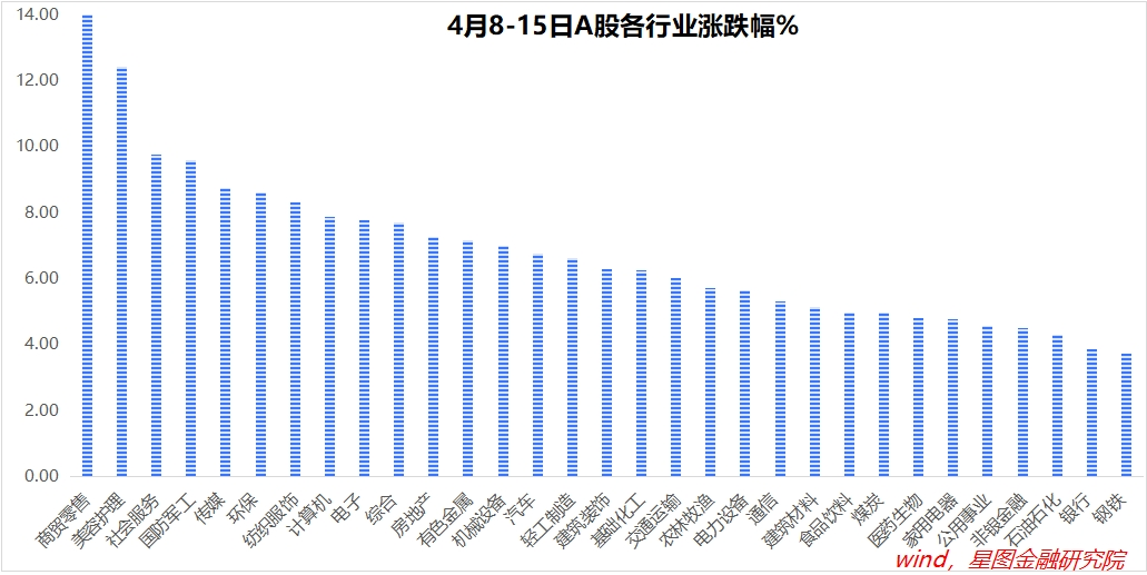 与金融危机、经济下行、疫情冲击等因素导致的单日大跌相比,4月7日的单日大跌由关税冲突引发,但关税对行业的短期影响具有很强的结构性特征——部分行业严重受损,也有部分行业明显受益(政策对冲预期)。这种情况下,当市场出现情绪性大跌后,那些潜在的受益板块就容易凝聚市场共识,走出单边上涨行情,直至收复失地。