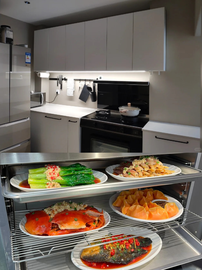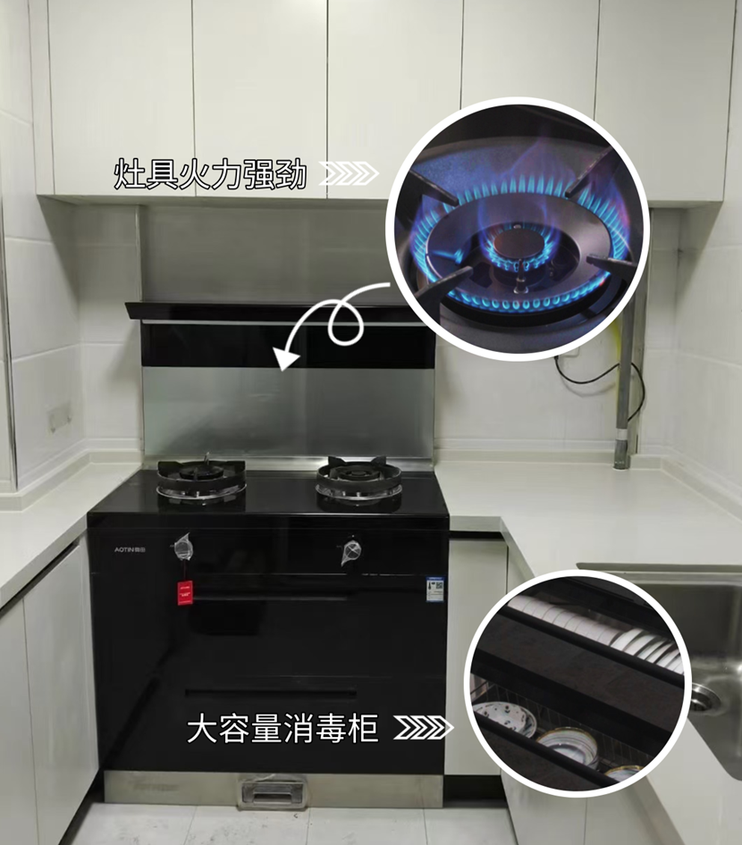 用户参与奥田「以旧换新」活动,选择了奥田消毒柜集成灶。烟机侧吸下排,吸油烟率高达99.96%,彻底解决了厨房油烟问题。惊喜的是,集成灶还自带消毒柜功能,餐具洁净与储物为一体。
