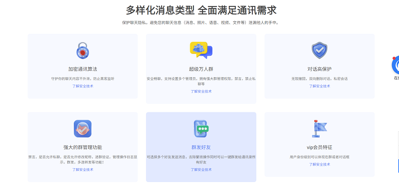 ◦ 支持文字、语音、图片、视频、文件(如文档、照片)等多种消息类型,满足日常交流、工作协作、远程会议等场景需求,尤其适合需要频繁传输多媒体内容的企业团队和社群用户。