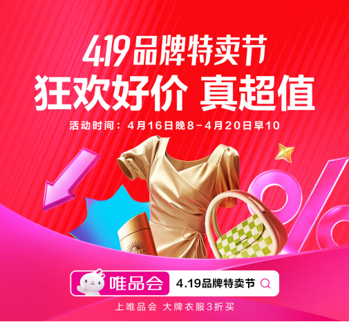 特卖电商唯品会宣布,其一年中最重要的大促活动之一4.19品牌特卖节于4月16日晚8点正式开启,活动将延续至4月20日早10点。
