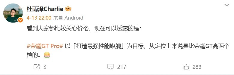 其他方面,荣耀GT Pro预计在前代5300?mAh电池基础上再增容1000–1200mAh,或将来到6500mAh,续航同样值得期待。至于大家更关心的价格,@杜雨泽Charlie曾爆料称“以「打造最强性能旗舰」为目标,定位将比现有的荣耀GT高两个档位。”预计价格将持平或略高于一加13和iQOO13。