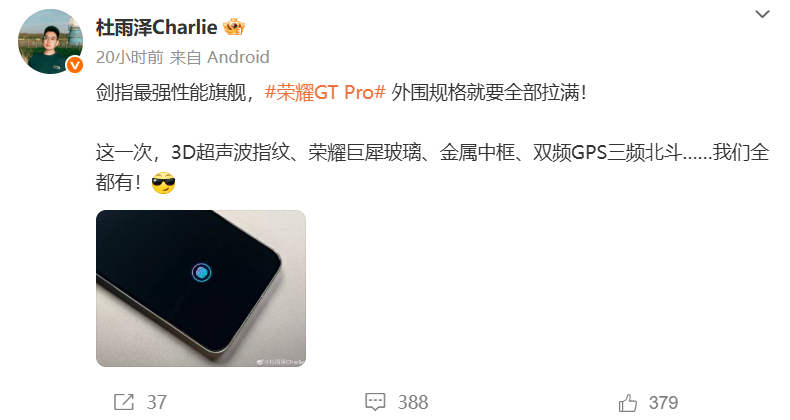 荣耀GT系列产品经理@杜雨泽Charlie在为新机预热时表示,荣耀GT Pro延续了经典的“GT图腾”设计,同时在设计上更加“低调内敛”。同时,他还称荣耀GT Pro将“剑指最强性能旗舰”,144Hz电竞直屏、九大荣耀绿洲护眼特性、3D超声波指纹、荣耀巨犀玻璃、双频GPS三频北斗等配置全都有,外围规格全部拉满。