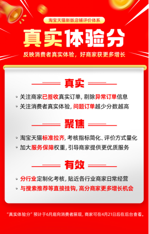 4月16日,淘宝天猫公告“关于新增《淘宝平台店铺真实体验分规范》的意见征集”,宣布即将上线新版店铺评价体系“真实体验分”。 公告称,淘宝天猫将重新制定能够真实反馈消费者体验的店铺评价体系,以解决行业虚假评分顽疾、提升消费者购买决策信心、激励商家提升服务质量。