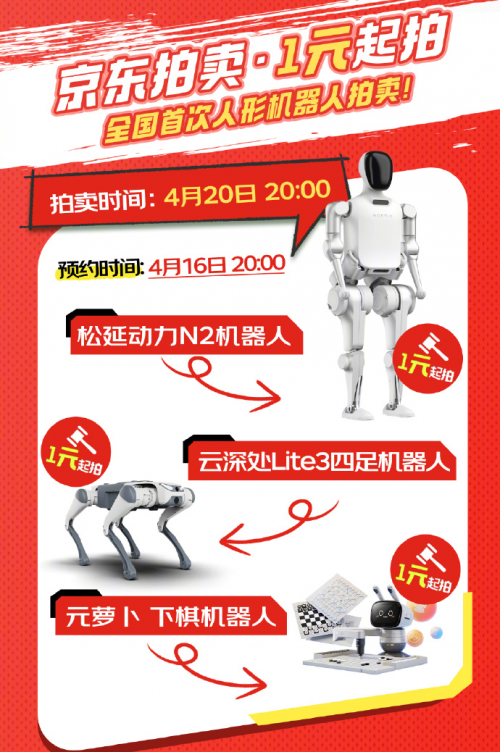 智能机器人产品不仅能在马拉松赛场上大展身手,也能在各种应用场景中展现出卓越的性能表现。京东一直密切关注机器人行业的发展,并引入了宇树科技、蔚蓝科技、众擎等品牌的机器人产品,为消费者提供丰富的选择。除了已上架的宇树G1人形机器人、众擎机器人之外,赛事同款机器人也将在京东同步上线,想要下单的用户可以打开京东APP搜索“机器人马拉松”进入会场,挑选心仪的机器人伙伴。此外,京东还将于4月20日晚8点举行全国首次人形机器人拍卖,松延动力N2机器人、云深处Lite3四足机器人、元萝卜下棋机器人等产品的起拍价均低至1元,4月16日晚8点起开始预约,想要抢先尝鲜的朋友不要错过这次机会。