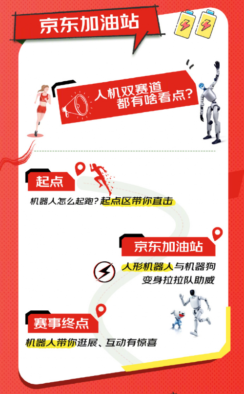 本次亦庄马拉松赛程从南海子公园南门出发,终点为经开区国家信创园,由12000名选手和20余家机器人企业的代表队一起跑完这段21.0975公里的路线。比赛期间,机器人将与选手们在起点同时鸣枪起跑,但各自拥有单独的赛道,很多朋友都对机器人的起跑方式感到好奇,京东也会带领观众们直击比赛起点现场,想第一时间了解的用户记得多多关注。比赛途中设有京东加油站,并安排有人形机器人与机器狗们充当啦啦队,为选手们加油助威,赛事终点还有京东机器人专属展区,多个参赛机器人将在此开启专属“个人秀”,游客与机器人互动有机会获得惊喜好礼,趣味十足。
