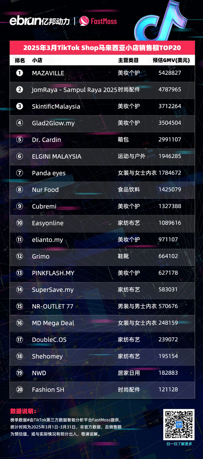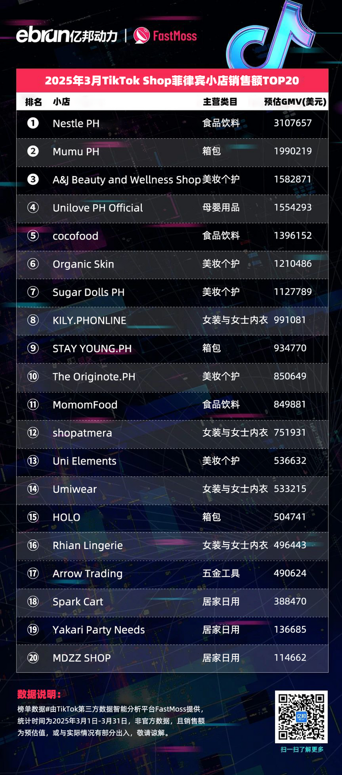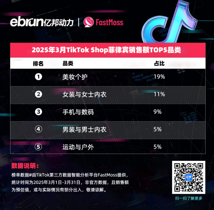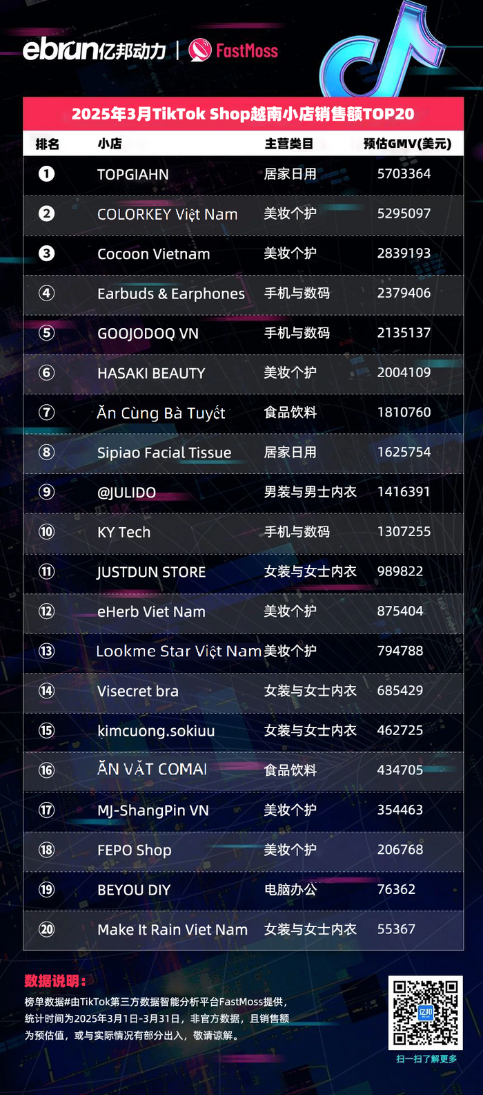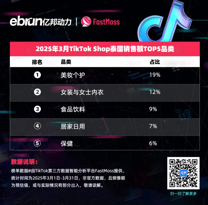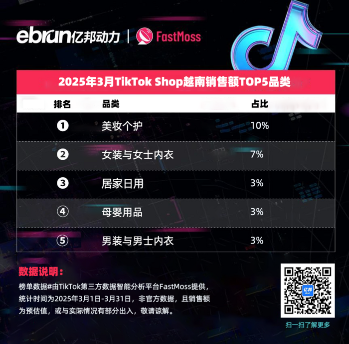 榜单数据由TikTok第三方数据智能分析平台FastMoss提供,统计时间为2025年3月1日-3月31日,非官方数据,且销售额为预估值,或与实际情况有部分出入,敬请谅解。