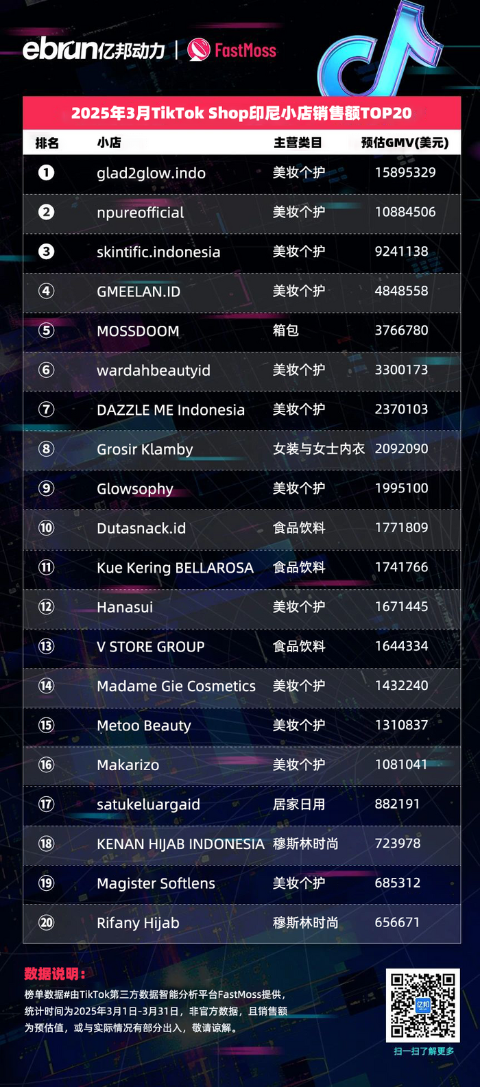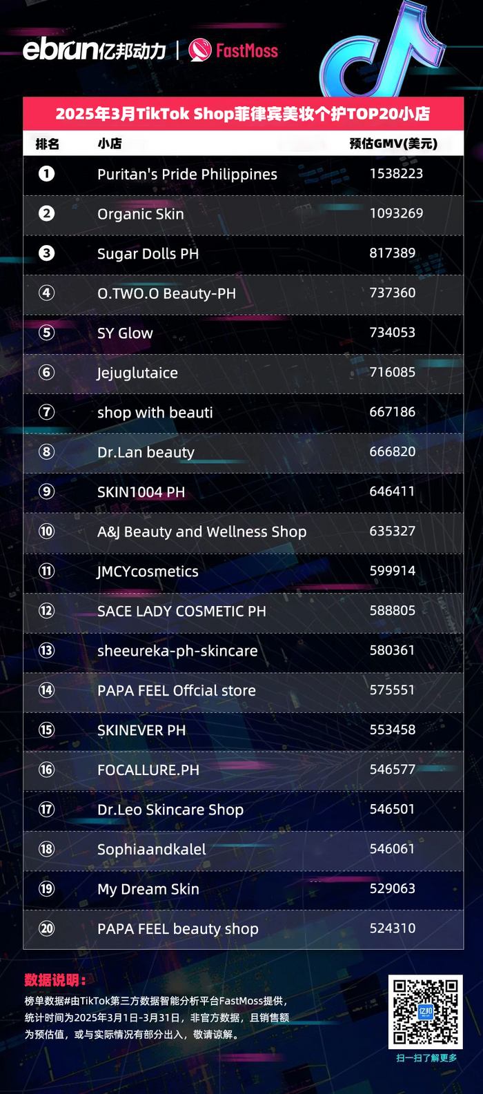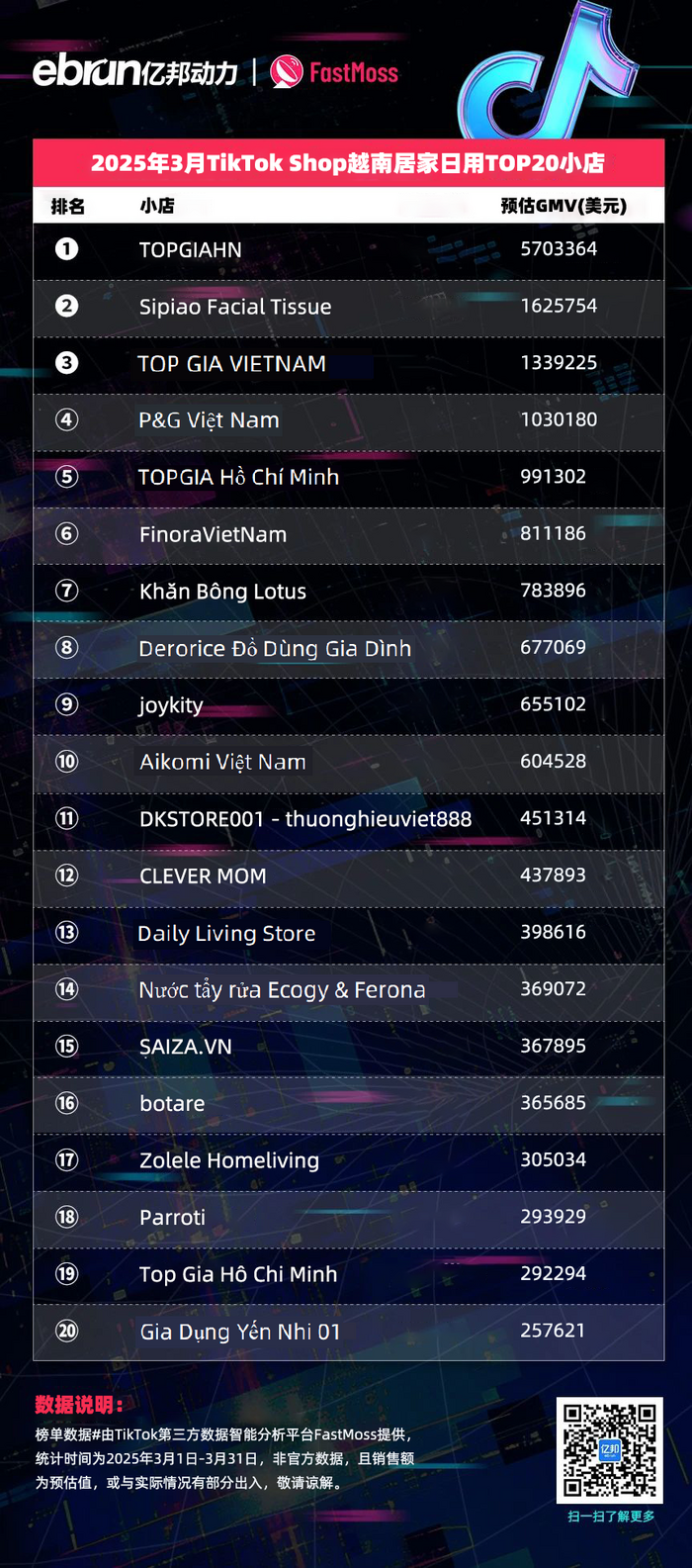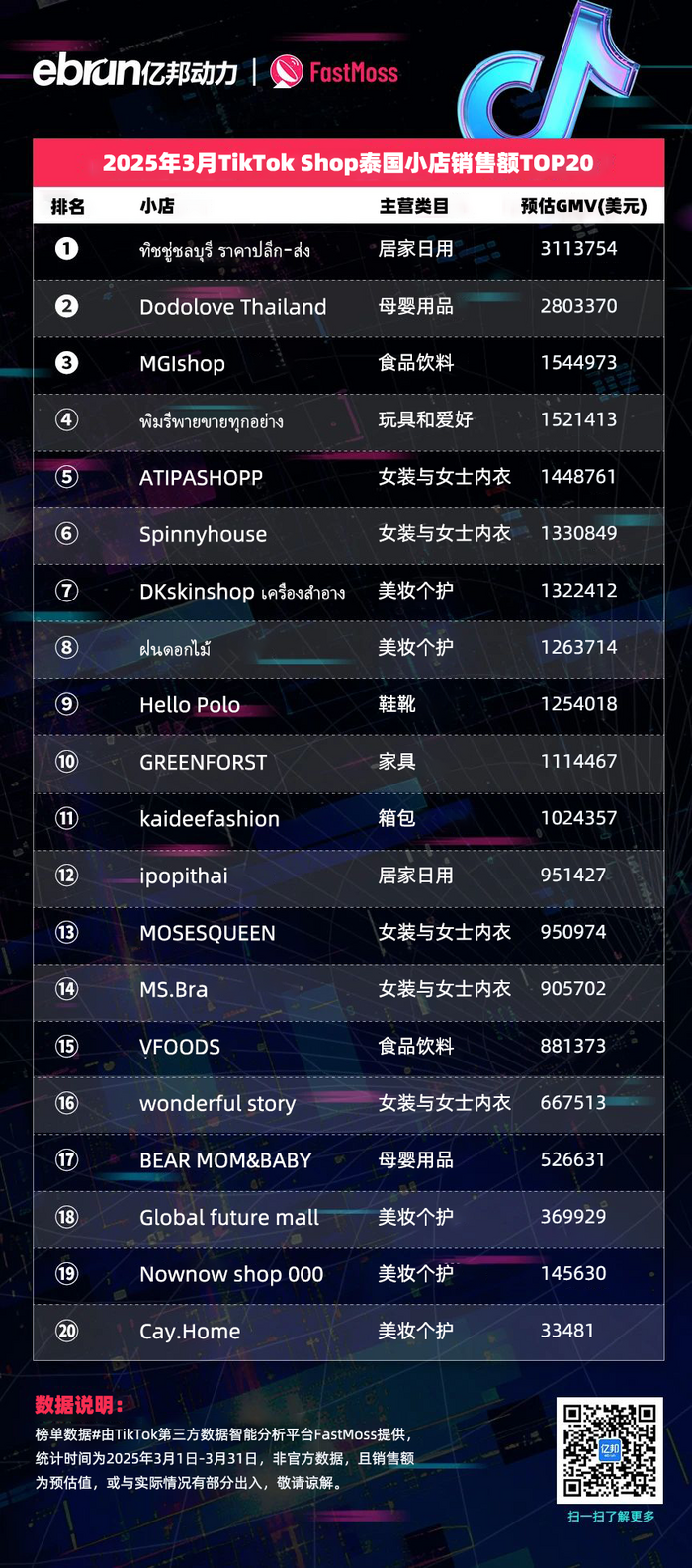 榜单数据由TikTok第三方数据智能分析平台FastMoss提供,统计时间为2025年3月1日-3月31日,非官方数据,且销售额为预估值,或与实际情况有部分出入,敬请谅解。