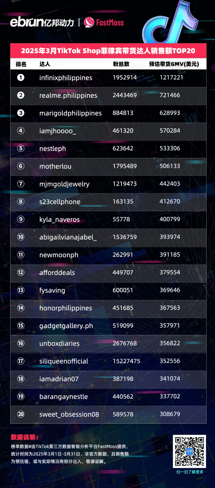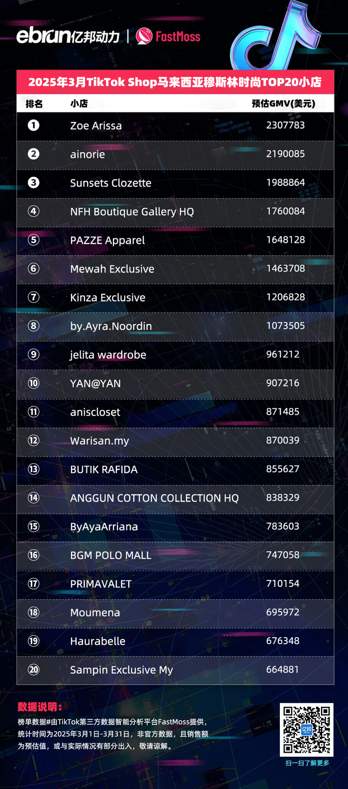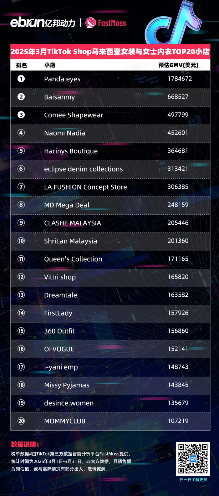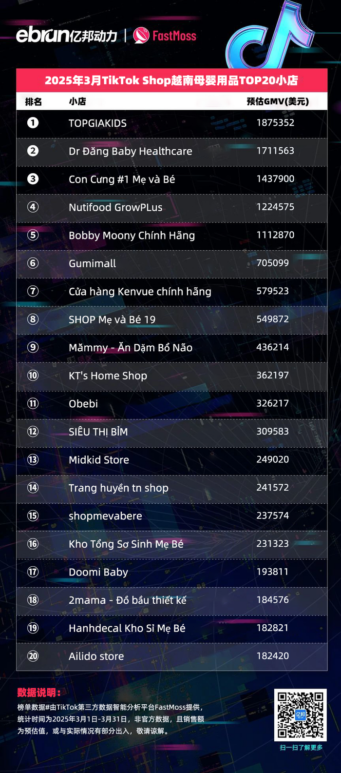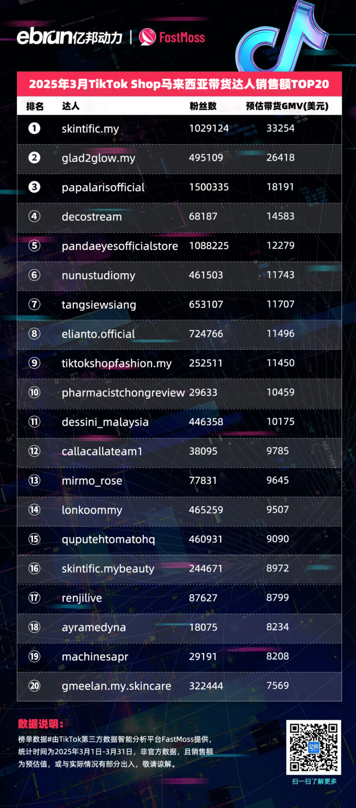 榜单数据由TikTok第三方数据智能分析平台FastMoss提供,统计时间为2025年3月1日-3月31日,非官方数据,且销售额为预估值,或与实际情况有部分出入,敬请谅解。
