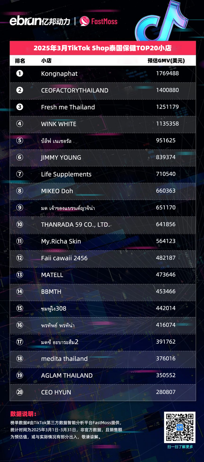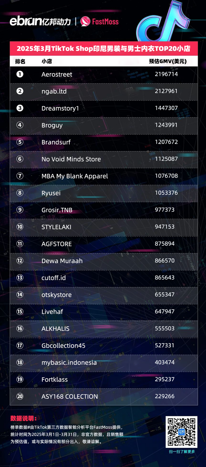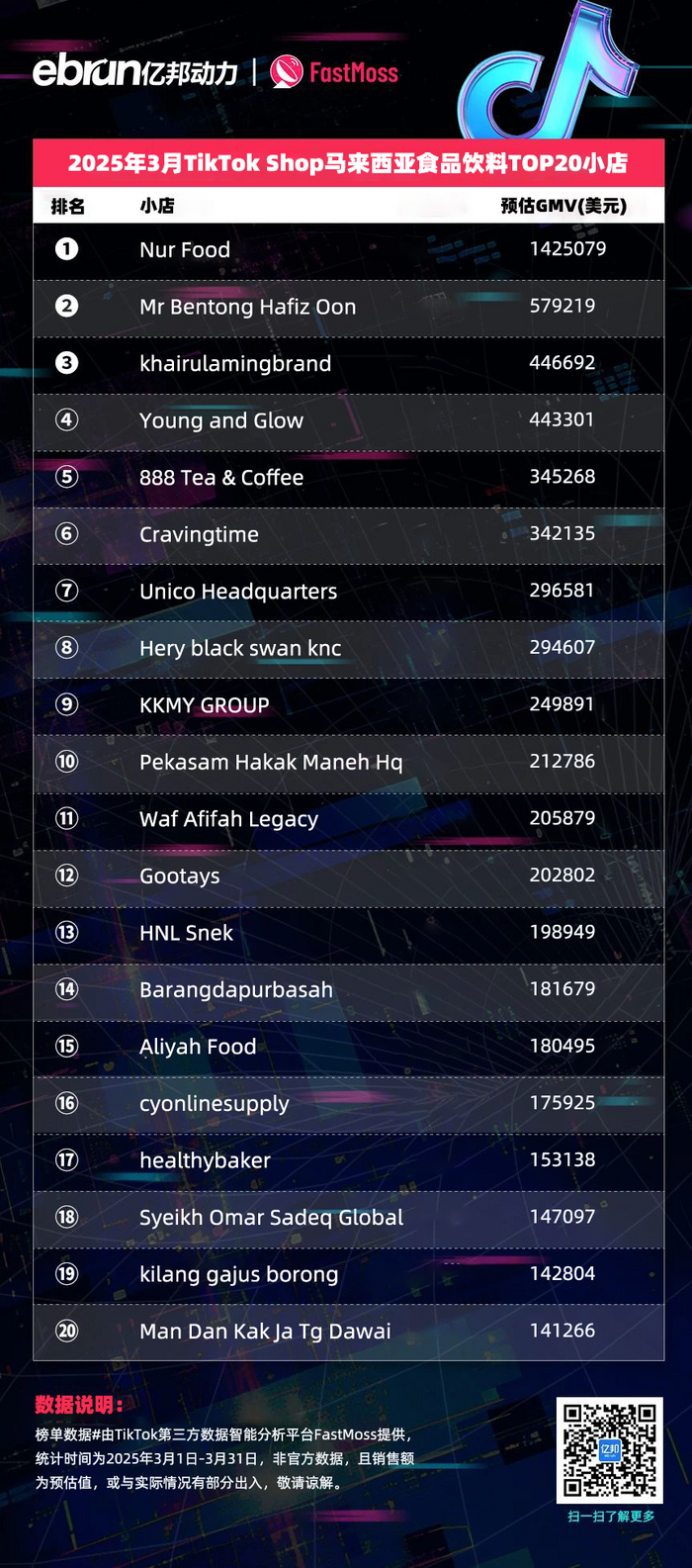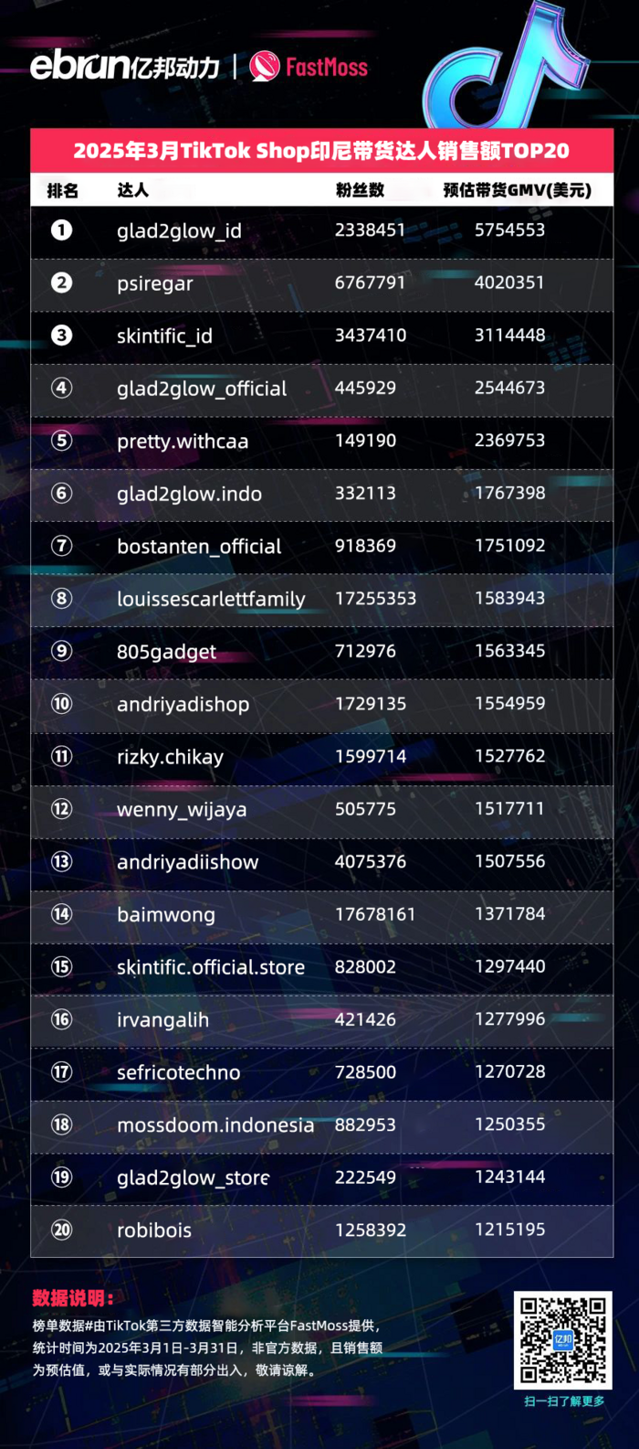 榜单数据由TikTok第三方数据智能分析平台FastMoss提供,统计时间为2025年3月1日-3月31日,非官方数据,且销售额为预估值,或与实际情况有部分出入,敬请谅解。