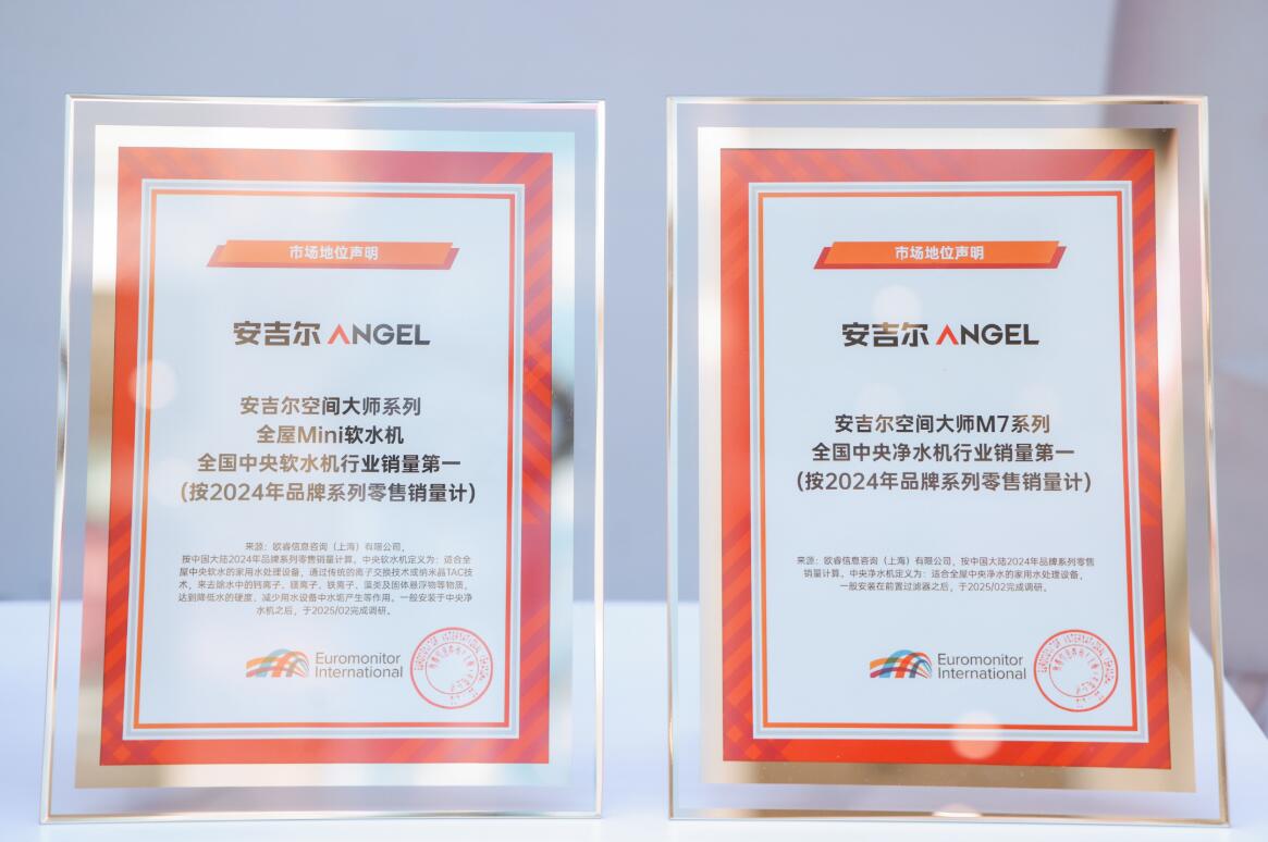 肖战代言的空间大师系列产品于2024年4月18日正式上市,凭借对“小体积科技”的创新突破获得由世界纪录认证机构(WRCA)颁发的“体积最小全屋净水系统”认证荣誉,上市一年更以品质赢得用户口碑,获得热销第一的卓越成绩。今年3月,世界权威市场调查机构欧睿国际调研报告显示,安吉尔空间大师M7系列和全屋Mini软水机零售量在2024年中国大陆市场的占有率分别为18%和13%,获得全国中央净水机和中央软水机行业销量第一。