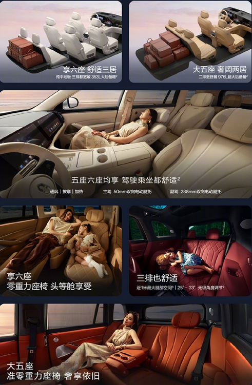 六座采用纯平地板设计,确保三排乘客均享有宽敞空间,二排搭载零重力座椅;大五座搭载二排准零重力座椅,靠背支持最大43°调节,乘坐更舒适。
