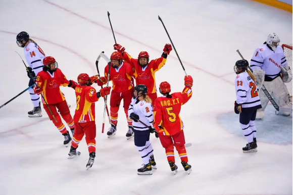 (资料图:2023年8月26日,中国队球员庆祝得分。当日,在2023年国际冰联女子冰球世锦赛(甲级A组)比赛中,中国队以2比1战胜荷兰队,以五战全胜战绩晋级2024年女冰世锦赛顶级组。新华社记者 梁旭 摄)