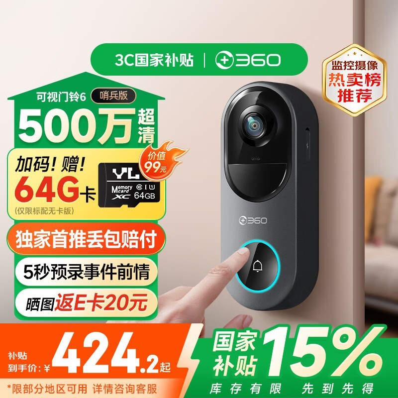 360可视门铃6哨兵版高清摄像头智能看家仅327元