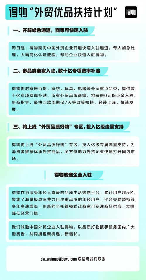 今日,得物发布公告,启动“外贸优品扶持计划”,向外贸企业开放快速入驻通道,并提供数十亿专项补贴,一系列政策支持,助力中国优质的外贸企业开拓国内市场。