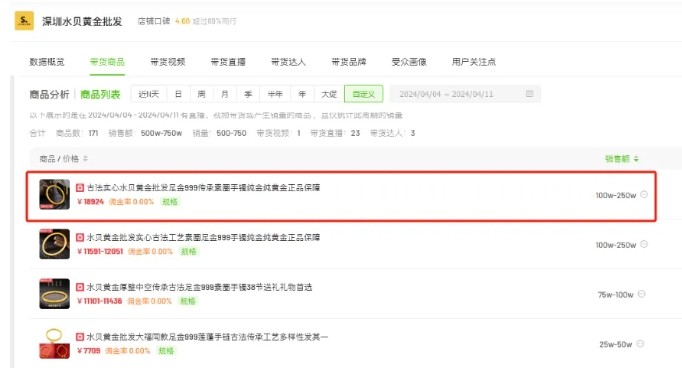 消费热情在线上同样可以被感知到。蓝鲸记者查询线上水贝黄金店铺发现,近一周同样多家店铺销量暴涨,不少水贝店铺的周销售额已达500万元,销量最高的日销售额有100万-250万元。其中一家水贝黄金店铺,近2万元的黄金手镯一周内卖出250万元。