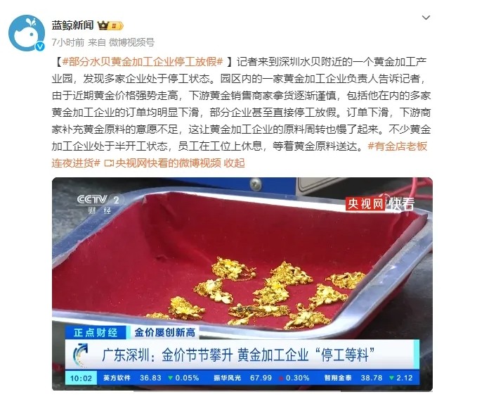 据央视新闻报道,深圳水贝附近的多家黄金加工企业目前处于停工状态。园区内的一家黄金加工企业负责人告诉记者,由于近期黄金价格强势走高,下游黄金销售商家拿货逐渐谨慎,包括他在内的多家黄金加工企业的订单均明显下滑,部分企业甚至直接停工放假。