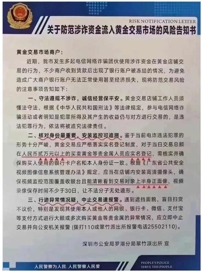 网传风险告知书中提到,近期深圳市发生多起电信网络诈骗团伙使用涉诈资金在黄金店铺交易的行为,不少商户收到货款后出现了银行账户被冻结的情况。