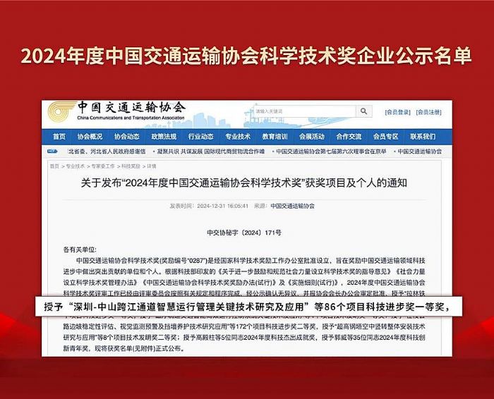 在众多申报项目中,上海三思电子工程有限公司的“深圳-中山跨江通道智慧运行管理关键技术研究及应用”凭借其卓越的技术创新、出色的应用效果成功入选科技进步一等奖。
